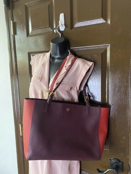 Tory Burch Emerson Buckle Laptop Burgunday Saffiano Leather Shoulder Bag