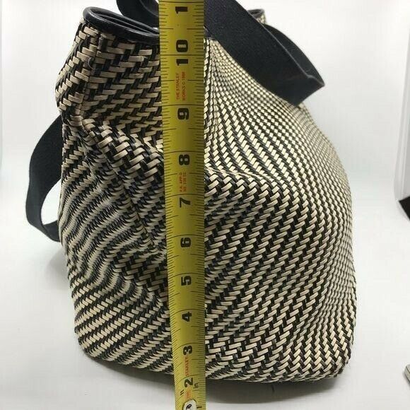 Large tote bag made of black/ beige weave material. Very large interior, perfect for everyday, at the park or overnight bag. Perfect for weekend shopping tote for the farmers market.