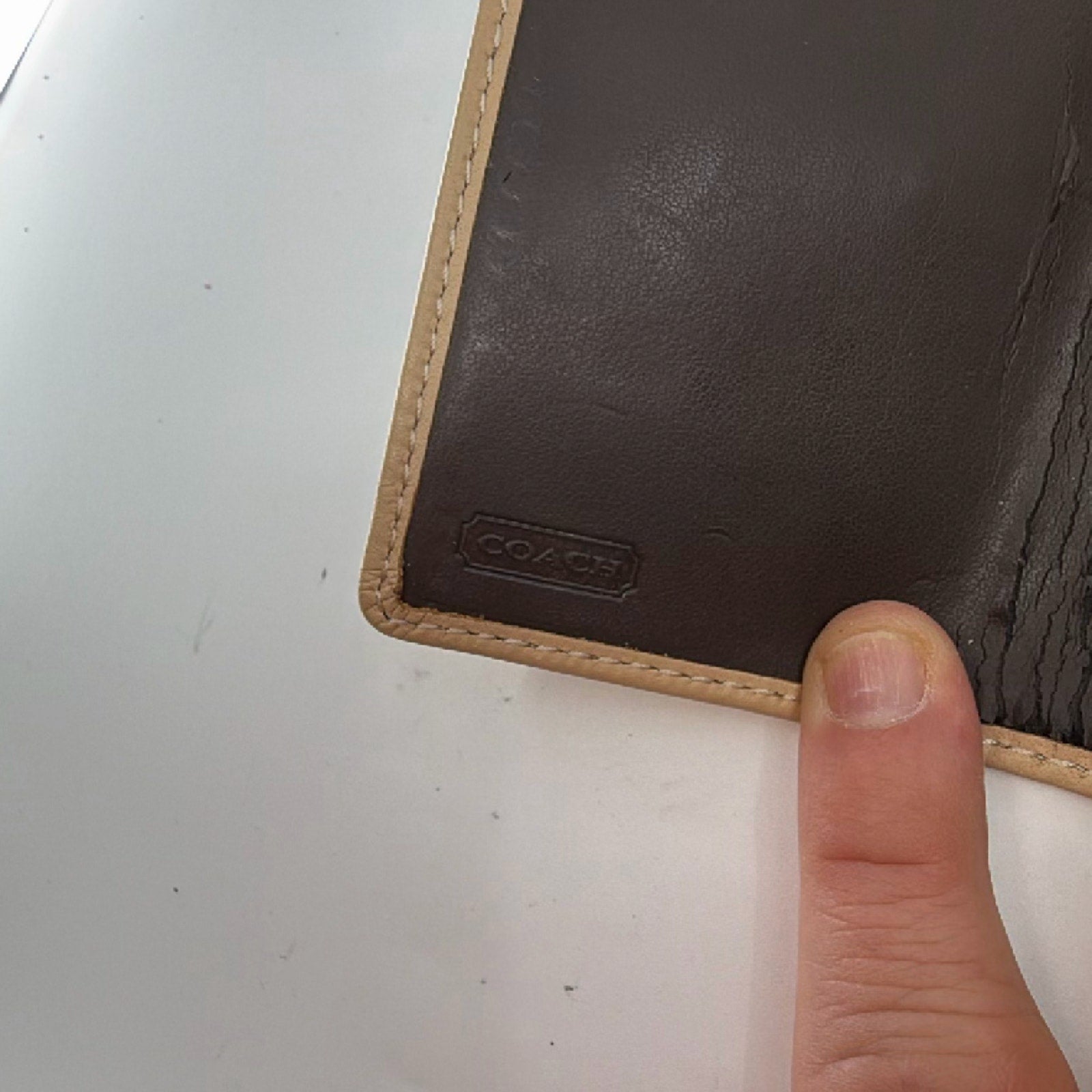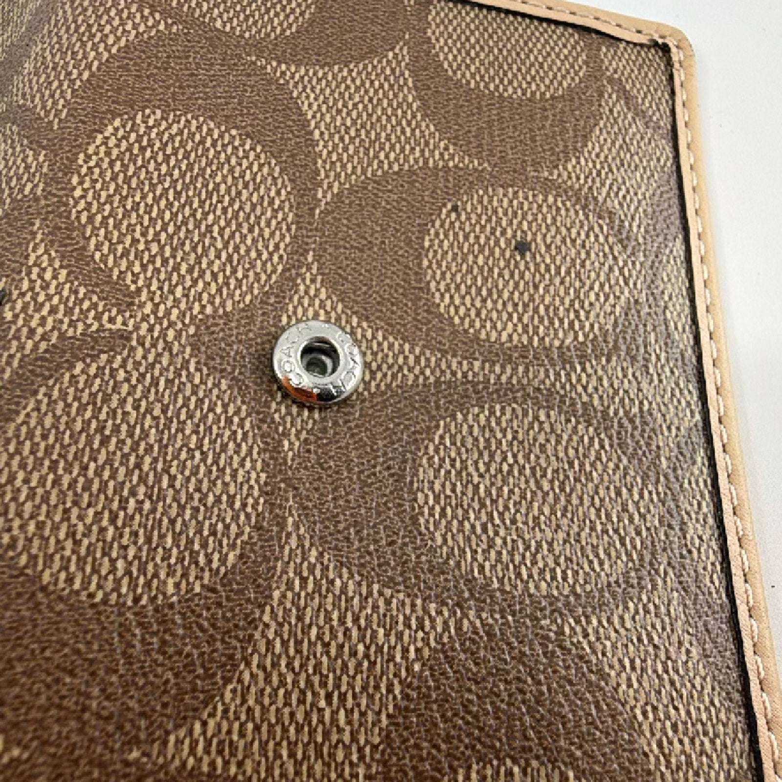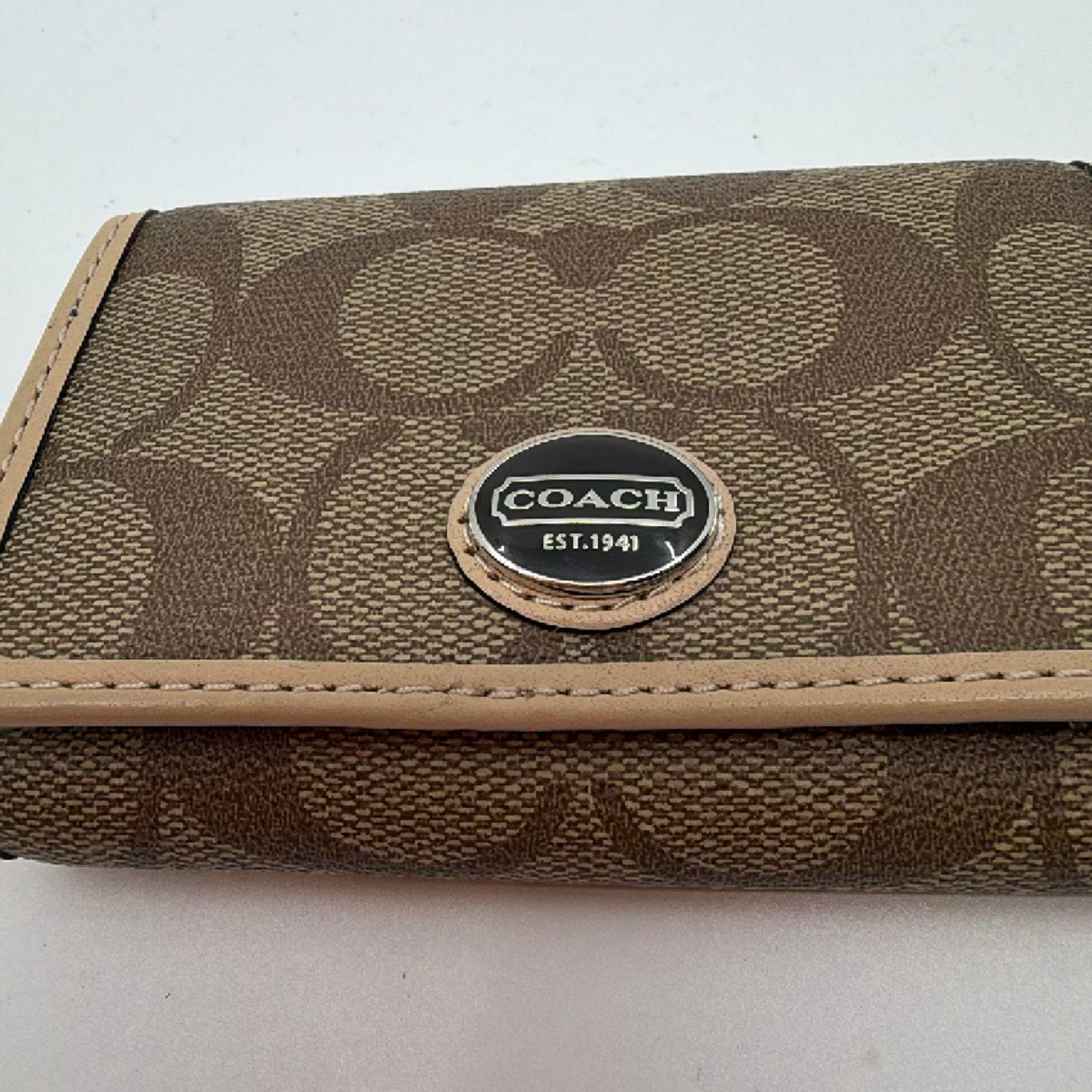 Organize your essentials with this classic Coach Signature C 6-Ring Key Case. Crafted from durable brown coated canvas featuring the iconic Coach monogram pattern, this trifold accessory is accented with light beige leather trim and silver-tone hardware. The front is adorned with an elegant oval 'COACH EST. 1941' plaque, adding a touch of brand heritage. Inside, the dark brown leather interior provides six individual key hooks, ensuring your keys are securely stored and easily accessible, preventing scratches to other items in your bag. Despite its fair condition, showing clear signs of use with notable creasing, scratches, and some minor cracking on the interior leather, this key case remains a highly functional and stylish piece for the discerning individual.Pick Location: D2CWP11SKU: 9717